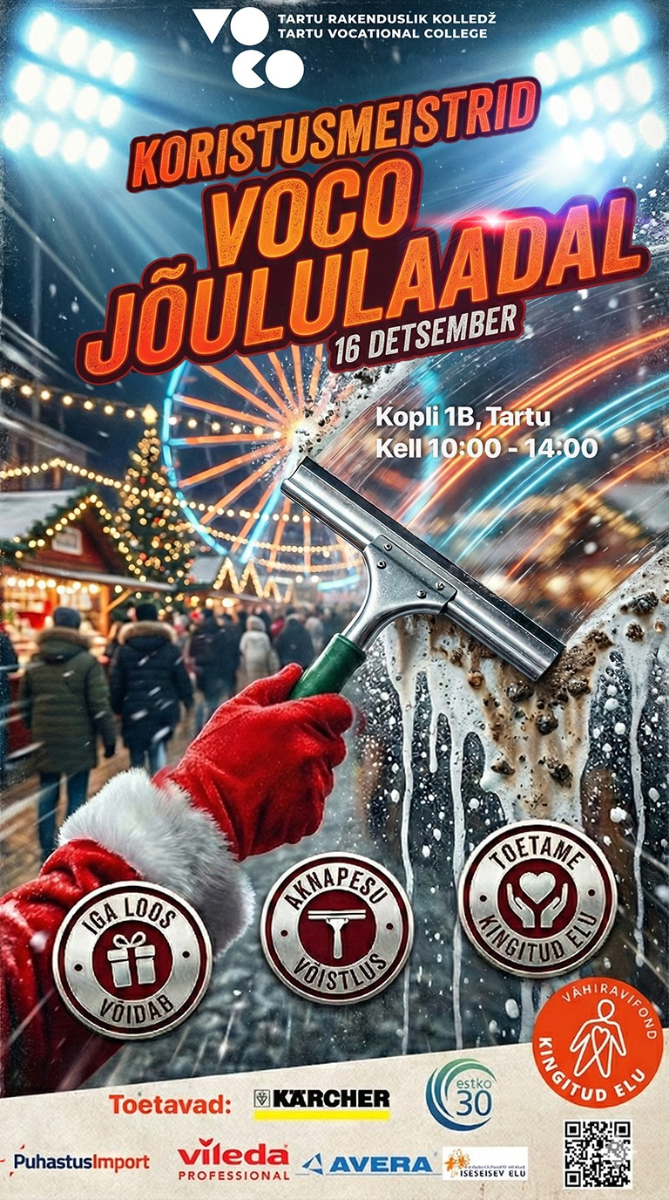 16.12.2025 kell 10.00-14.00 on Tartu VOCO täis jõulurõõmu, praktilisi tegevusi ja heategusid. Koristusmeistrid kutsuvad kõiki külla, et osa saada vahvast programmist, kus jätkub tegevust kõigile.